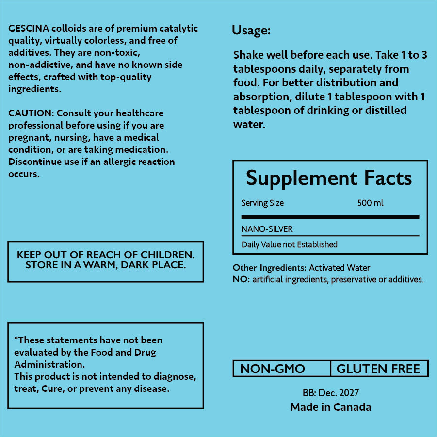 At GESCINA, ensuring quality and purity is our priority. Our Silver Pure Colloidal is carefully produced using advanced techniques to create ultra-fine particles for potential improved absorption. Available in various sizes, our bottles offer options for discounts on multiple purchases.